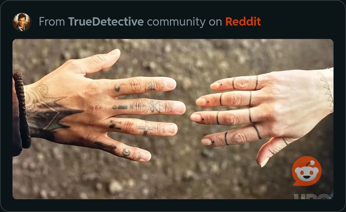 Supernatural elements intertwined with murder has always been an integral component of True Detective. Cohle introduces the myth surrounding The Yellow King to Hart in an existential conversation in the first season. A popular theory among dedicated fans of True Detective ties the mythological Sedna to the murder mystery. In the Inuit story of Sedna, a girl becomes a goddess after she's thrown into the ocean by her father. In retellings, Sedna is desperately grasping the boat, trying to pull herself up. Her fingers are severed by him, leaving her to drown. Sedna’s fingers are referenced in a drawing by Deputy Prior’s son Darwin of a girl with missing fingers. A woman in the first episode, abused by her husband, had missing fingers. This comes into play again in later episodes.